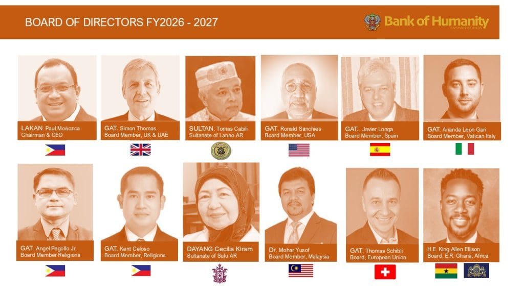 “The Bank of Humanity” (Bangko Maharlika Ltd.) is a Sultanate based entity with representative offices in the United Kingdom, Luxembourg and the United Arab Emirates. This hybrid central bank traces its roots to a historical and noble empire in South East Asia which was eradicated by colonial rule for over 300 years. This long and lost empire, which definition was derived from the Sanskrit “Maharddhika (महर्द्धिक)”, meaning rich, prosperous and powerful ; “Merdeka” (Malay / Indonesian) which means independent or free, “Manlica”, found in the Boxer Codex (a 16th century Spanish manuscript), meaning freeman and “Maharlika”, meaning feudal warrior class or freeman, has lived in the hearts and minds of its people for generations
